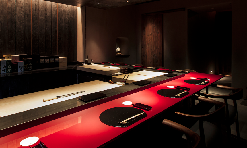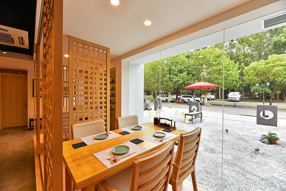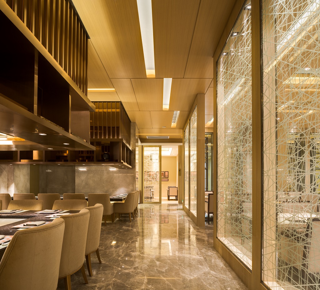 红KURENAI,位于茂名北路的丰盛里内,园区内复建及仿建的老建筑都保留了上海石库门里弄特色。餐厅入口长廊营造日本京都的“町屋”风格,使用80%深度烧制的杉木,长廊整体如同一个半室外的日式茶庭(日语中称为“露地”)。地面材质选择也秉持了侘寂的极简主义,所有花岗岩铺装均从上海近郊乡村回收废弃老石板后加工而来。我们选择用玻璃砖制作洗手台(日语中称为“蹲踞”),通过将玻璃砖的短边置于正面,便于自然光折射
